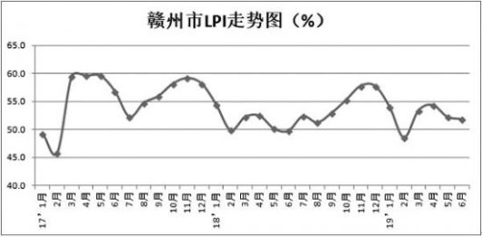 赣州市LPI走势图(%) 7月4日,赣州市物流协会发布了6月赣州市物流业景气指数。6月赣州市物流业景气指数为51.9%,较上月回落0.4个百分点,但仍然保持在景气区间运行,反映出当前物流市...