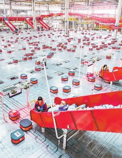 春节将至,年货物流迎来高峰。湖北武汉一家物流公司仓库的智能分拣平台上,300多个“小红人”头顶快递包裹忙碌奔跑,这些智能分拣机器人每小时可分拣1.8万个包裹。 陈 勇 常 燕摄...